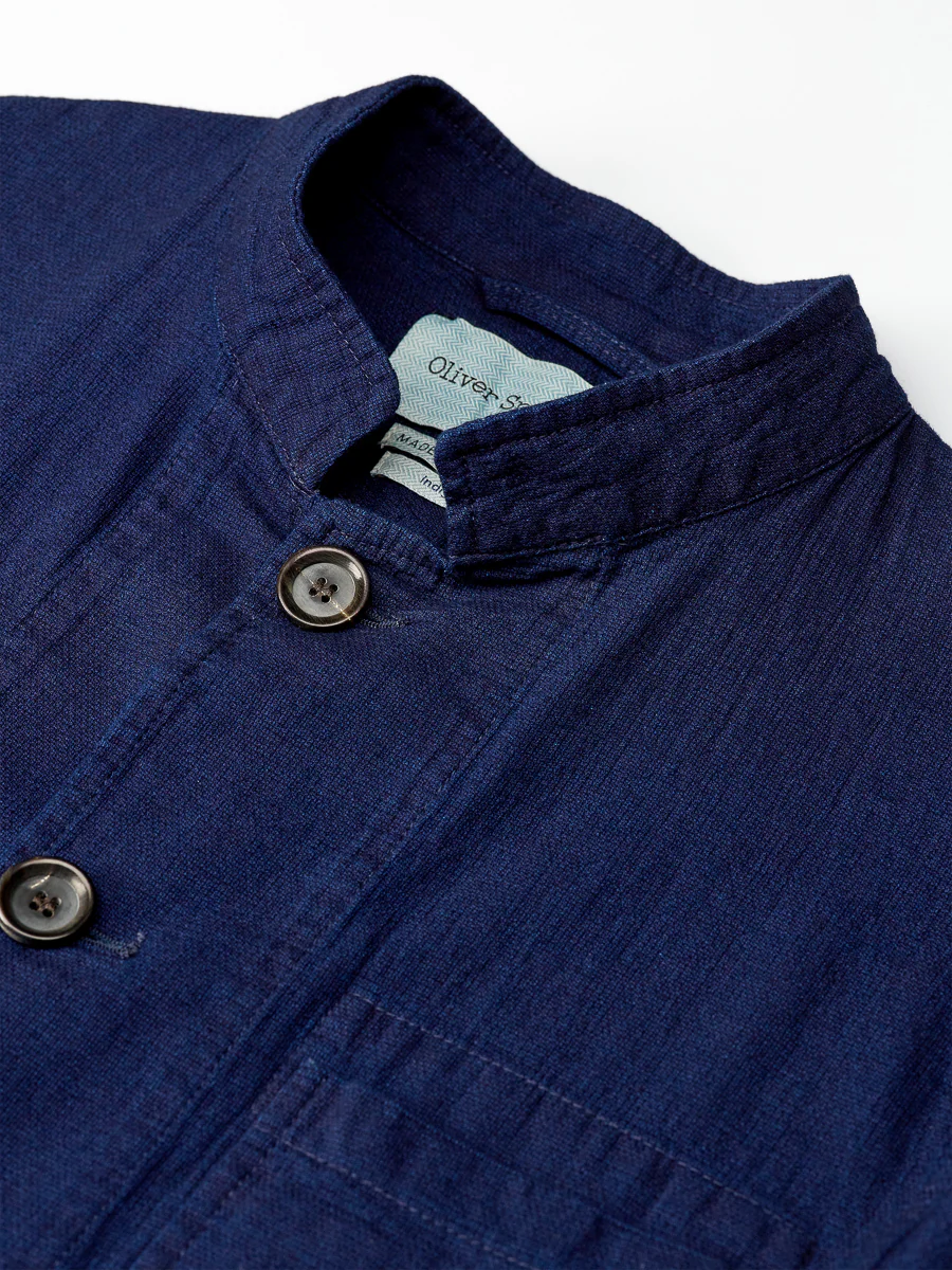 The Coram Jacket is our unstructured take on a classic Nehru style. Referencing elements of the chore jacket, this style is cut in lightweight, textured organic cotton. Featuring a stand Nehru collar it is unlined with an internal patch pocket. It's a great alternative to a Harrington blouson and perfect for summer layering.