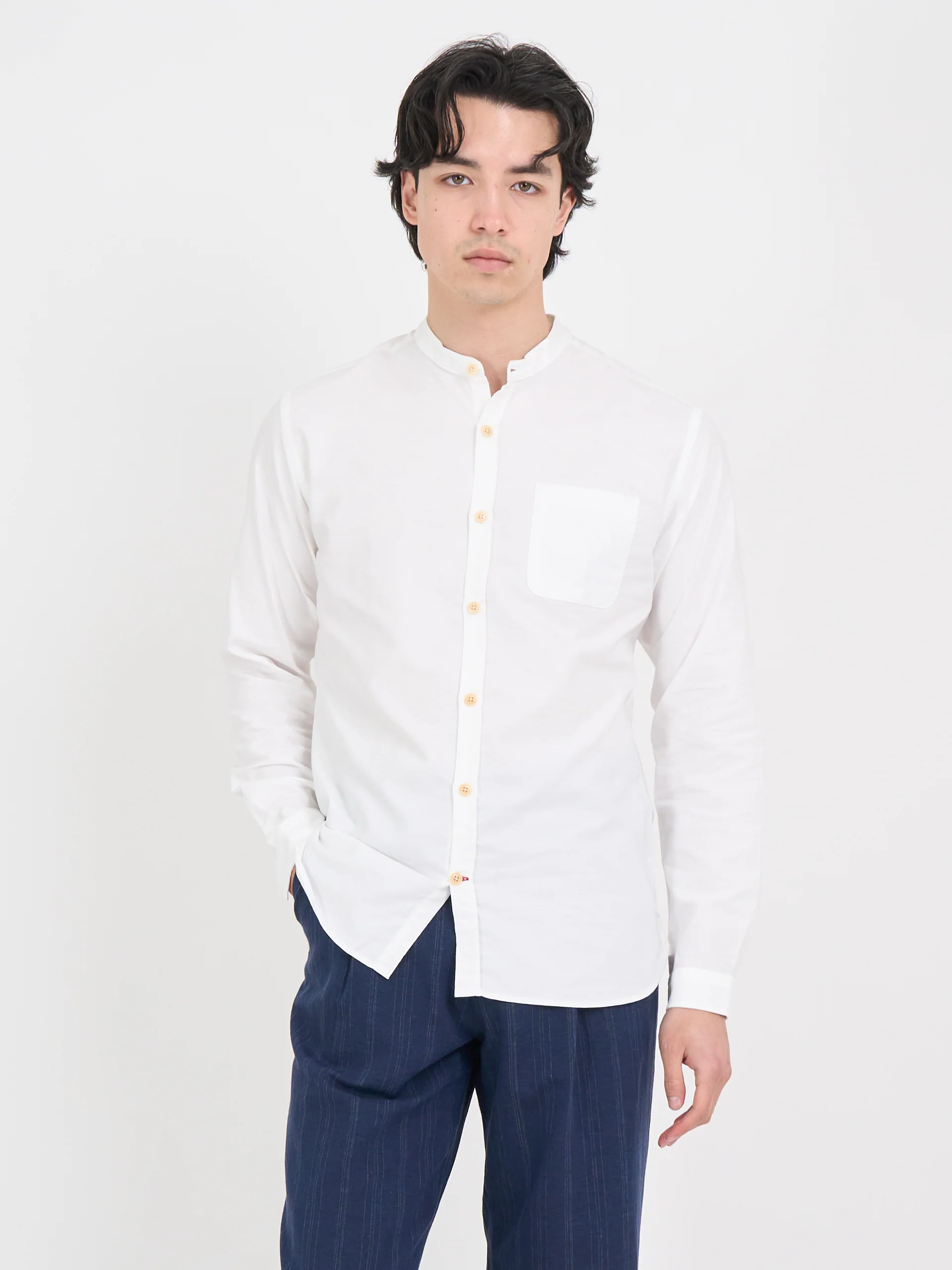 Born of utilitarian origins, the grandad collar has become a workwear classic, dressing down the archetypal men's shirt to something altogether more relaxed. This version has been cut in 100% organic cotton and makes for a relaxed autumn/winter shirt that's simple to style.