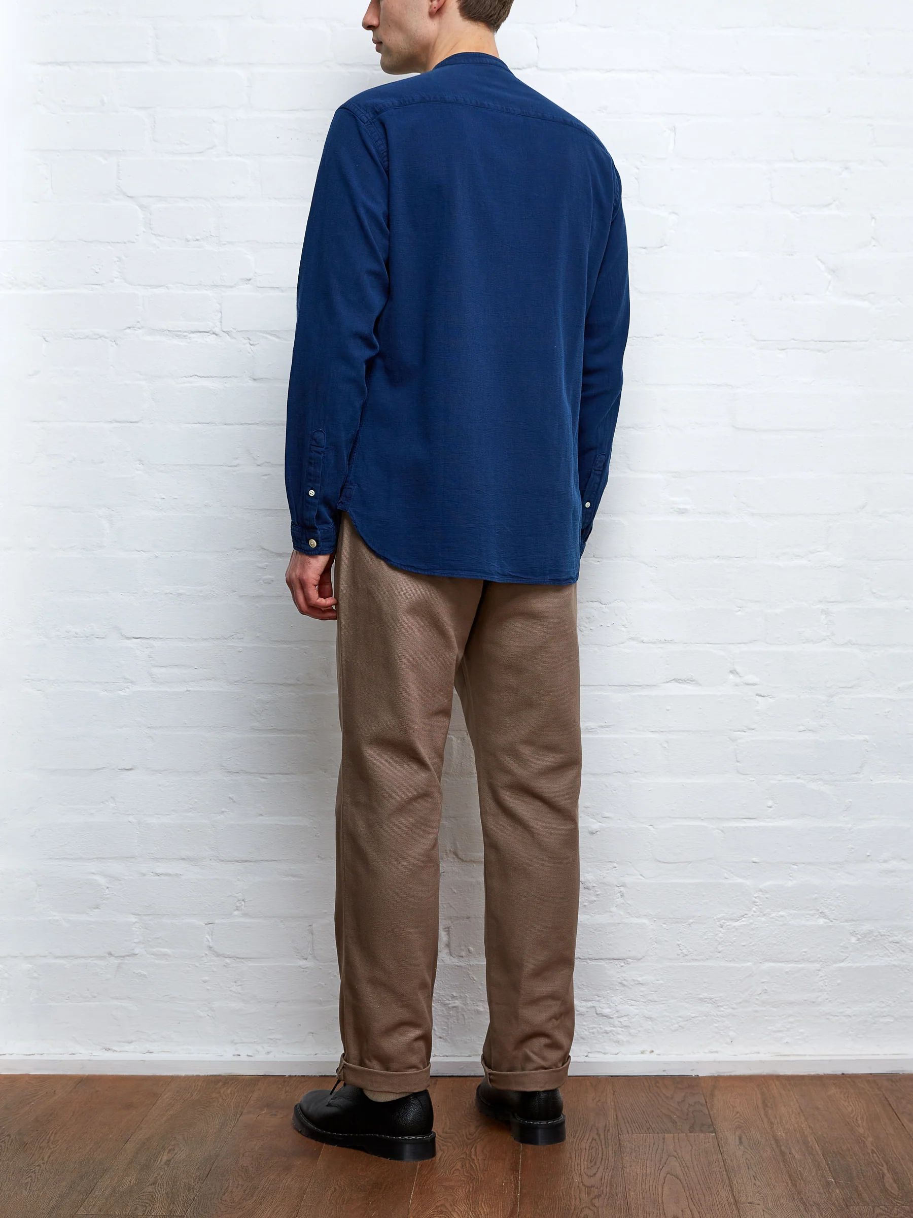 The grandad collar comes from humble origins, but has cemented itself in the pantheon of modern menswear. We've taken the workwear classic and updated it with this lightweight indigo-dyed cotton, ideal for wearing on its own or beneath one our cotton knits. Be sure to give it a few washes before introducing it to a cream sofa.